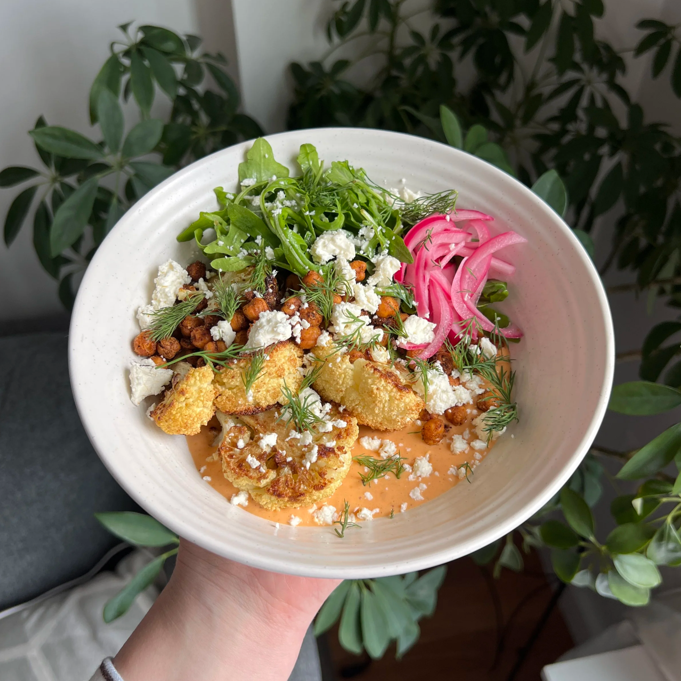 To the serving bowl, add a few spoonfuls of the silken tofu harissa sauce, then add the desired amount of cauliflower, crispy chickpeas, and pickled red onions. Add a handful of arugula or greens of choice. Garnish with dill and crumbled feta.
