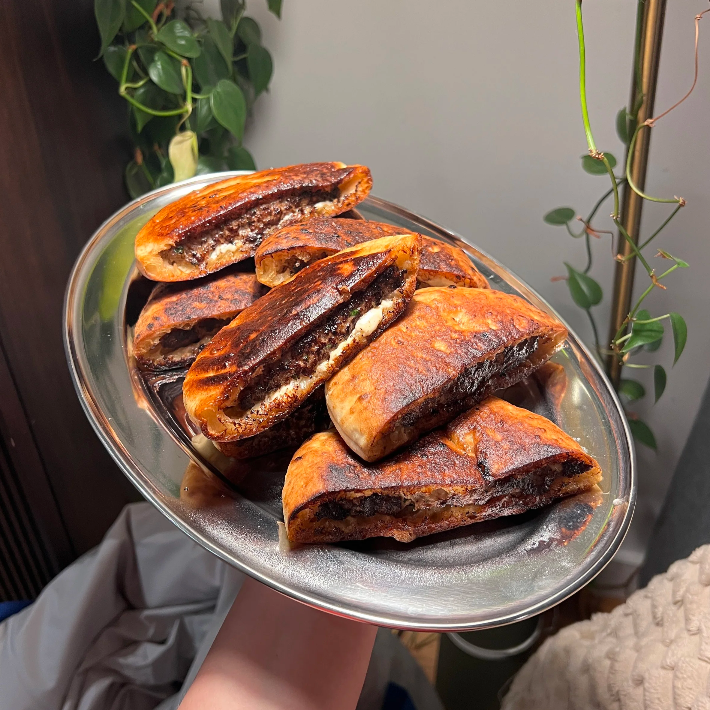 Flip the arayes a final time on the exposed meat side (the edge of the pita pocket where the filling is visible) and sear until it achieves a dark brown crust. Remove them onto the prepared baking sheet and place them in the oven to finish cooking.