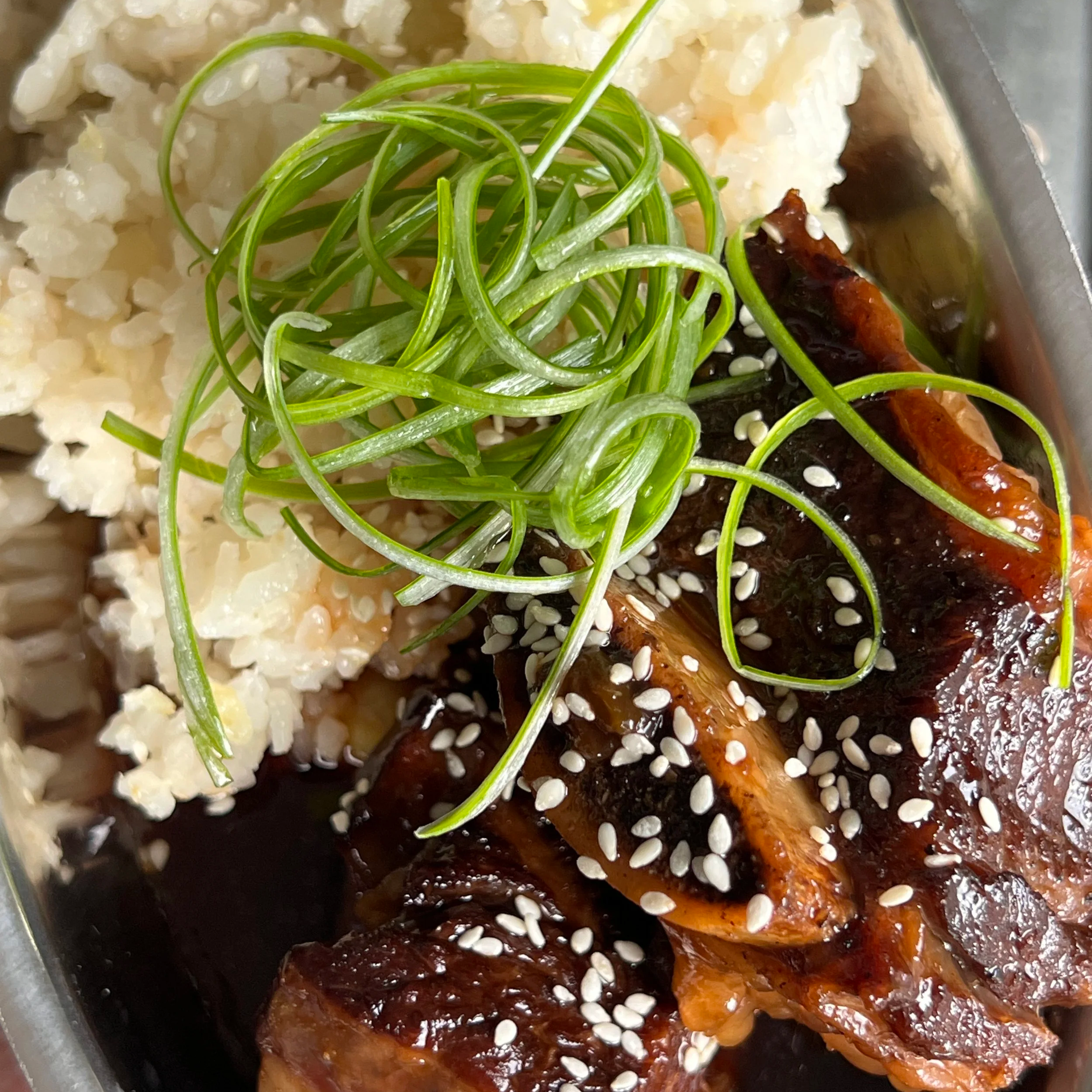 Serve the soy braised short ribs over the Japanese sweet potato sushi rice. Garnish with sesame seeds and the thinly sliced green scallion tops.